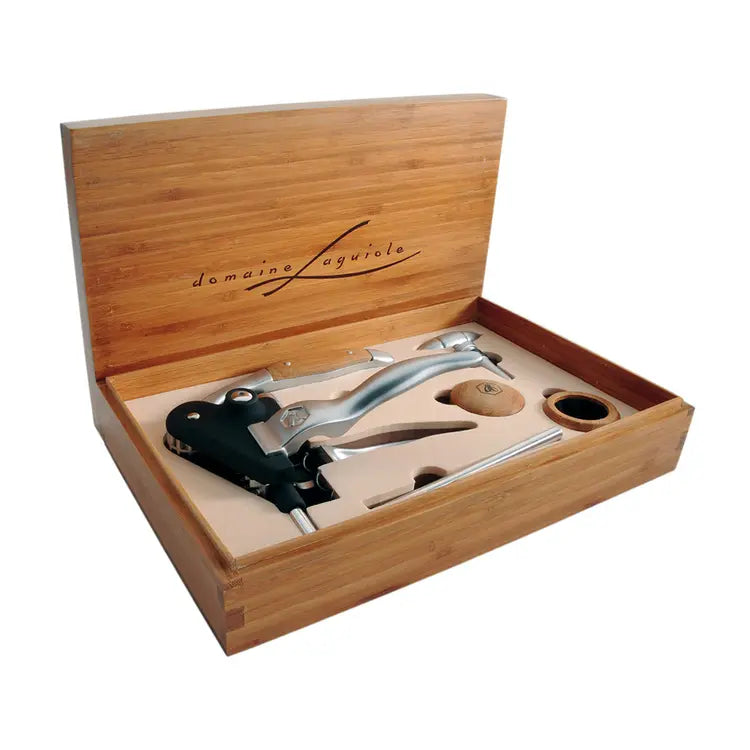 Descubre la manera más elegante y práctica de abrir tus vinos. Este set profesional incluye un sacacorchos de palanca de alta precisión, espiral de repuesto, cortacápsulas y accesorios esenciales, todo presentado en una caja de bambú sofisticada. Ideal para amantes del vino, regalos especiales o uso en casa con un toque de lujo.